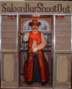 Check out our fantastic 3D, animated Quick Draw shoot out game! Two players stand in the free-standing chaps at the front of the Saloon Bar stand. As the Saloon Bar doors spring open, the "Cowboy" raises his arm to shoot and the 'Draw' sign illuminates, each player must draw their replica revolver from their holster and shoot at the cowboy as quickly as possible. Can you beat the quickest score and hold the record for the fastest gun?